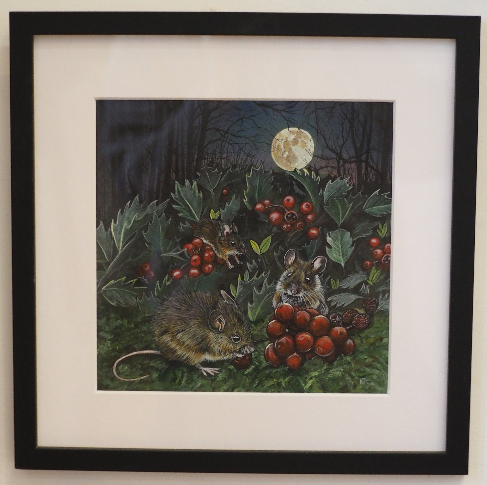A family of three little wood mice have found a bounty of holly berries to feast on in the midst of winter. December's full moon, known as the 'cold' or 'oak' moon, shines bright behind illuminating their little dining area.