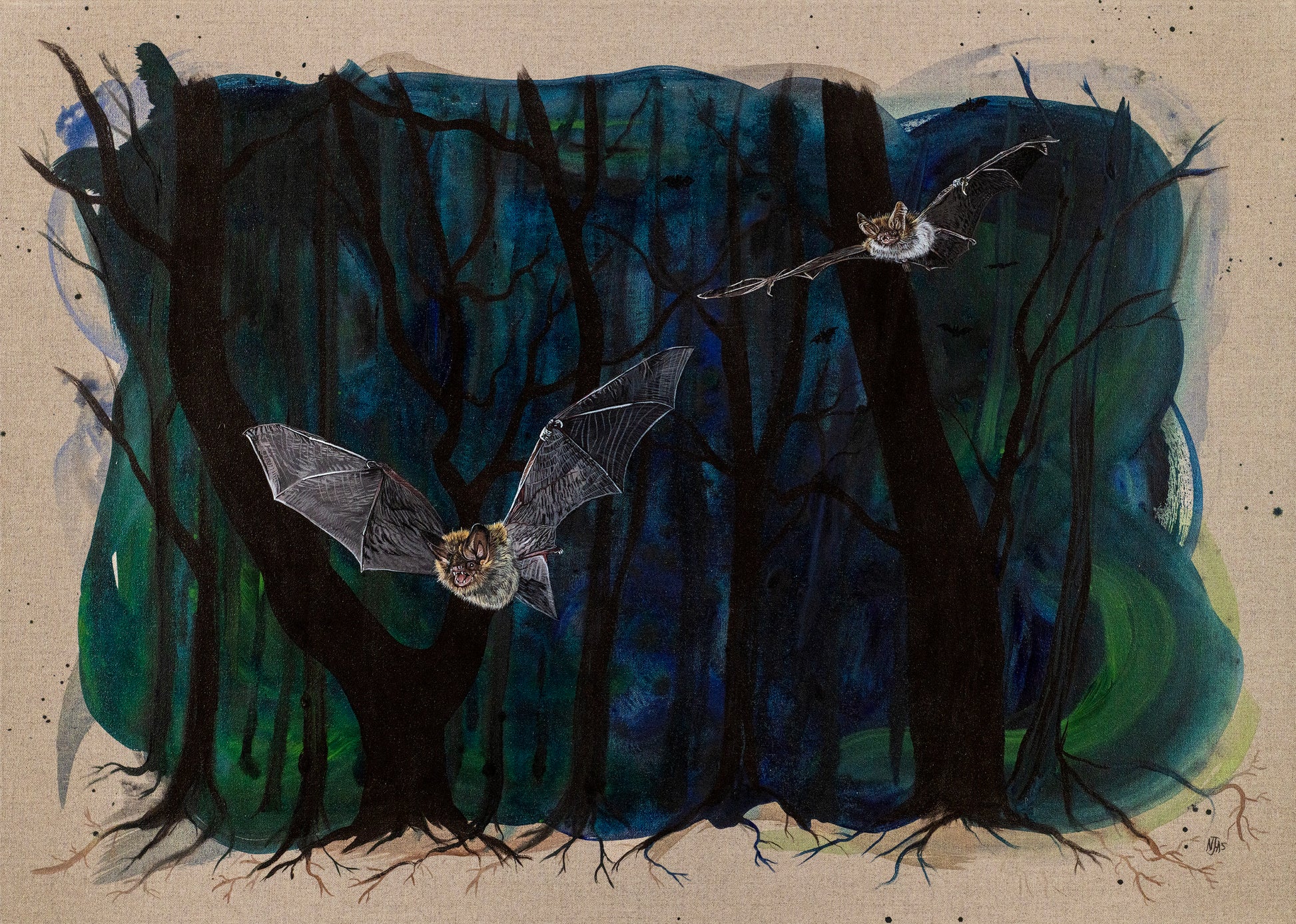 We are incredibly lucky that our local Wiltshire Wildlife Trust site at Green Lane Woods is home to many rarer Bechstein's bats. They have been carrying out some amazing habitat enhancing work there to support the bats further. This piece was painted in response to my research at the site, and finished with a special ochre paint I made from clay I found at the site (as seen on BBC Countryfile).