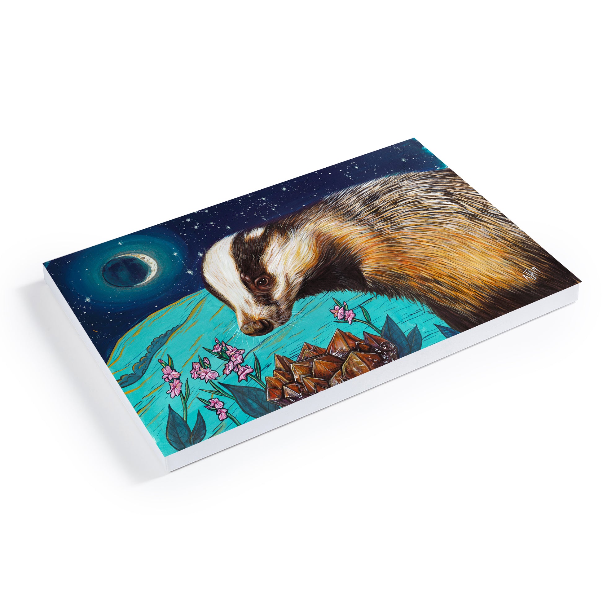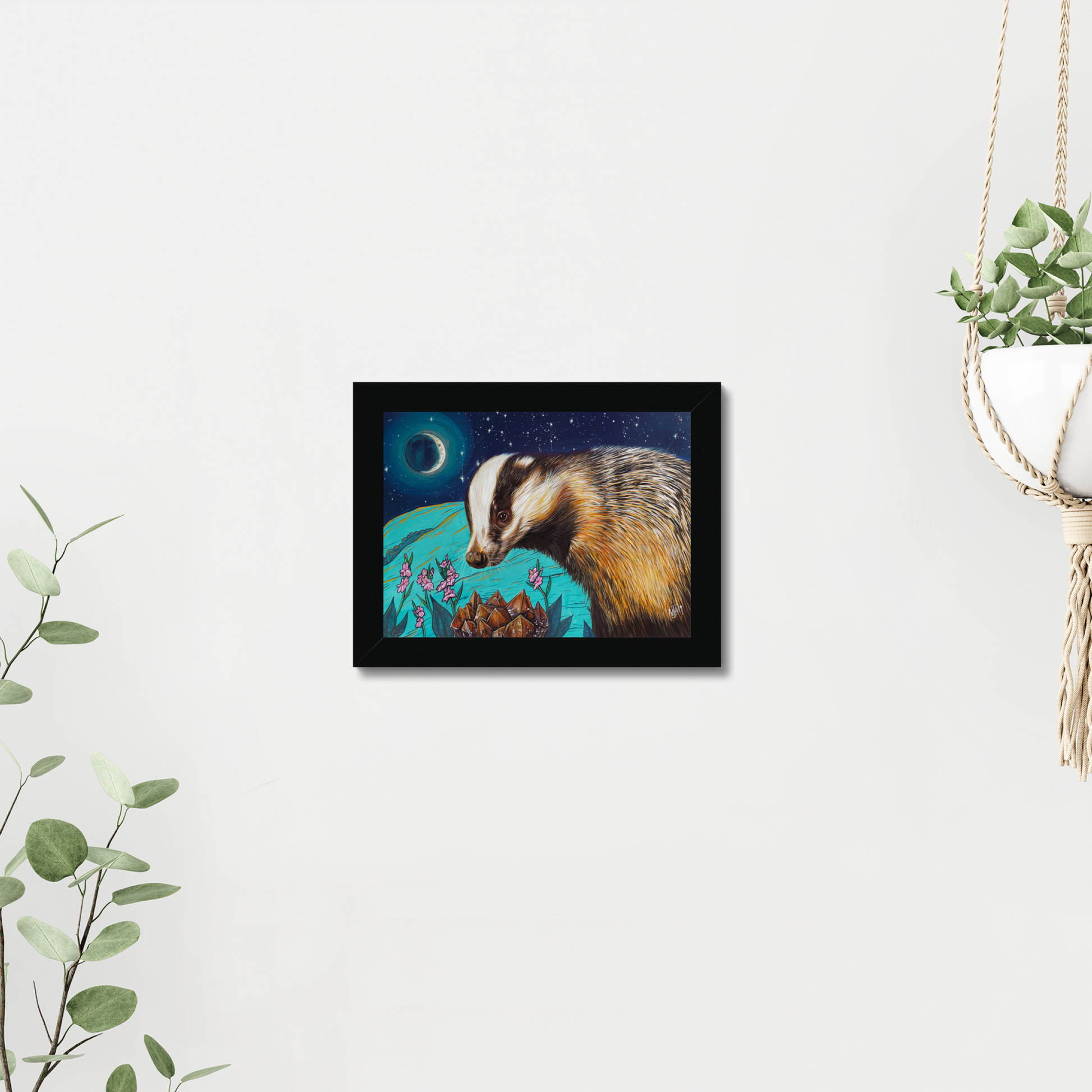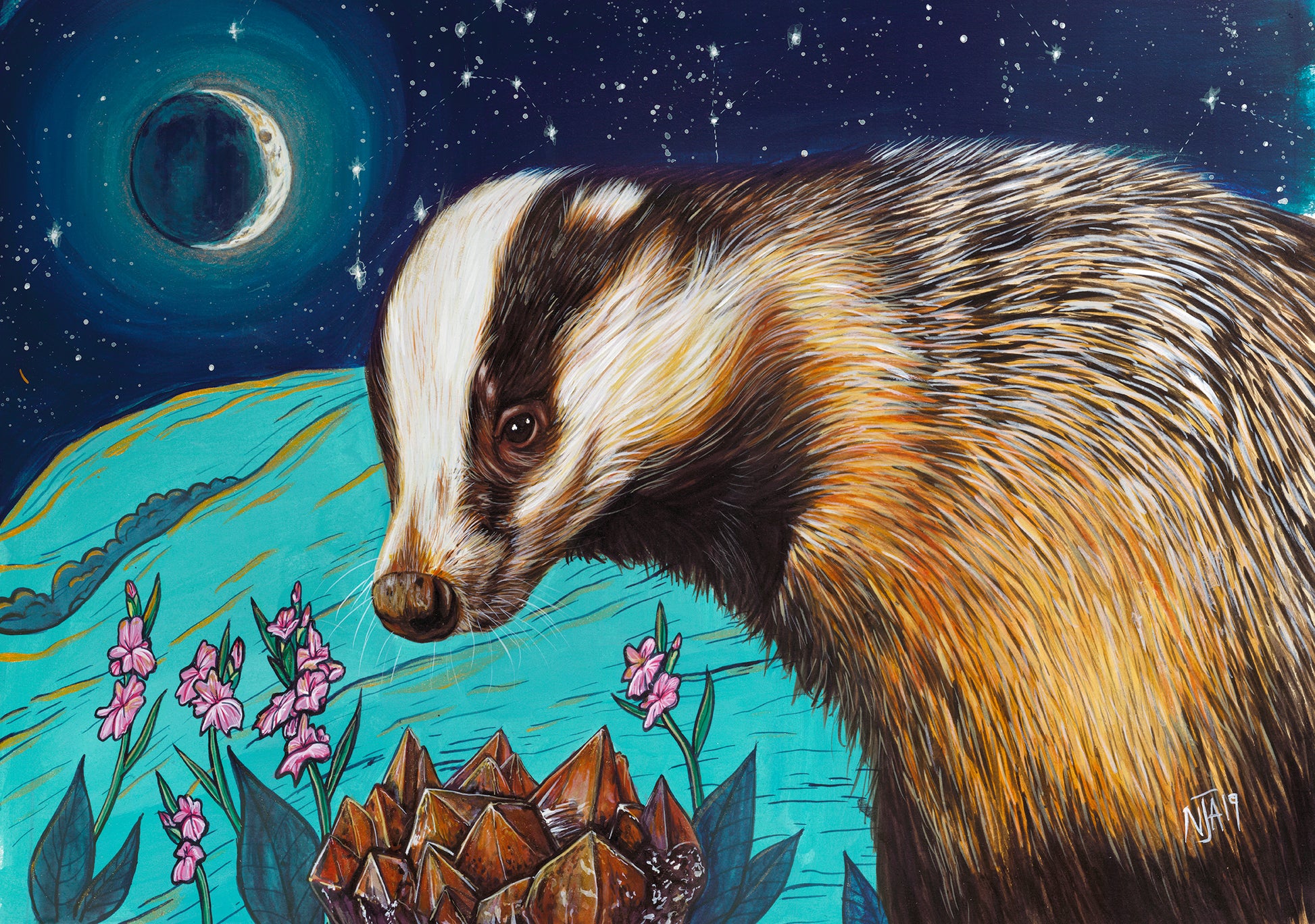 Therefore, this piece focuses around emphasizing the courage in badgers and those who endeavour to help this wonderful, native species. Under the waxing crescent, a time to grow, there is the star sign of Leo that emphasizes energy, courage and honesty. The flowers are Gladiolus which have an heroic meaning coming from the Latin “Gladius” which means sword and symbolises strength, victory and pride. The Red Amethyst with its addition of Hematite brings the energy of courage, tenacity and inner strength.