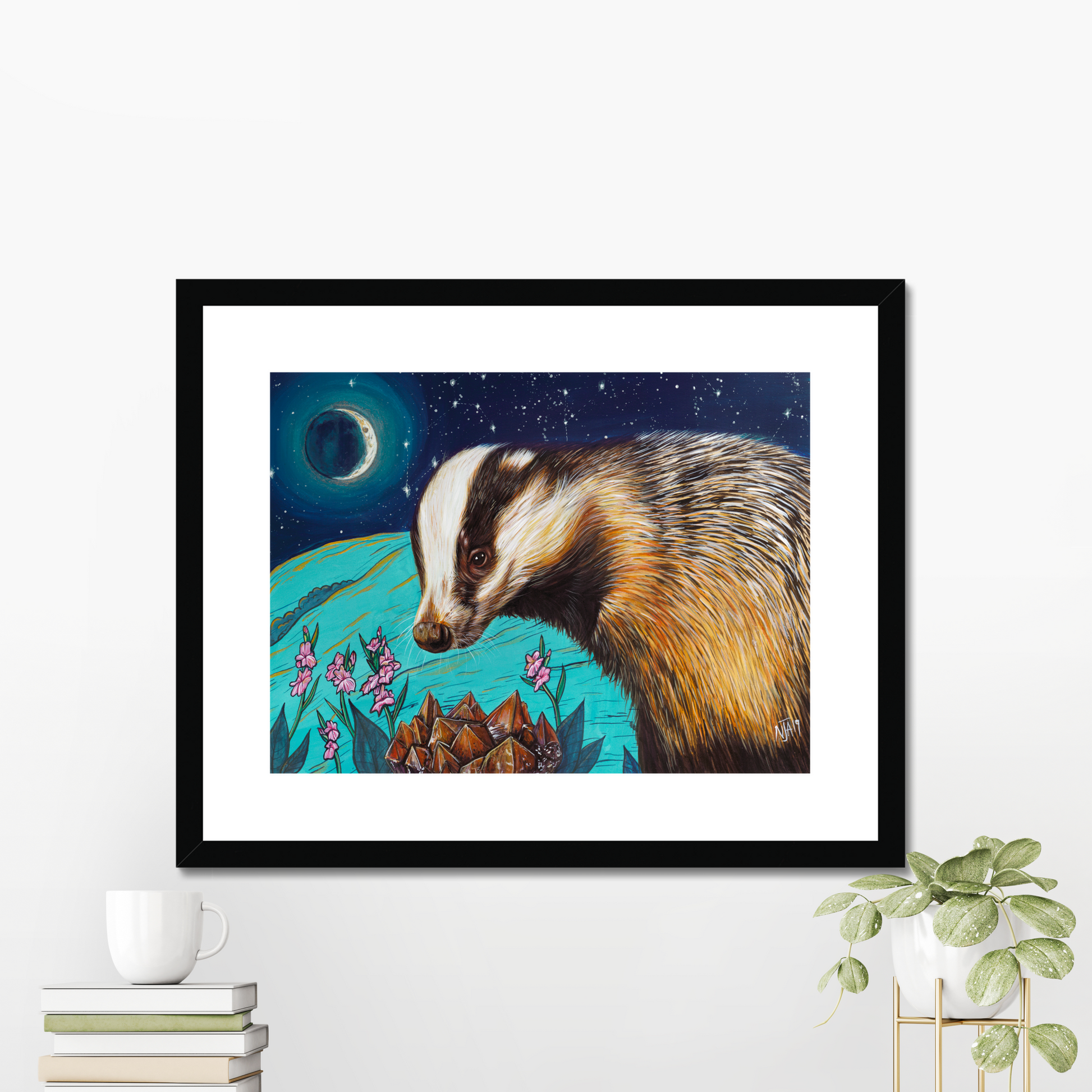 A framed print (the same 315gsm 100% cotton rag paper) with sustainbly sourced wood frames available in different colours, with a “conservation grade”, sustainably sourced, 100% acid free mount.