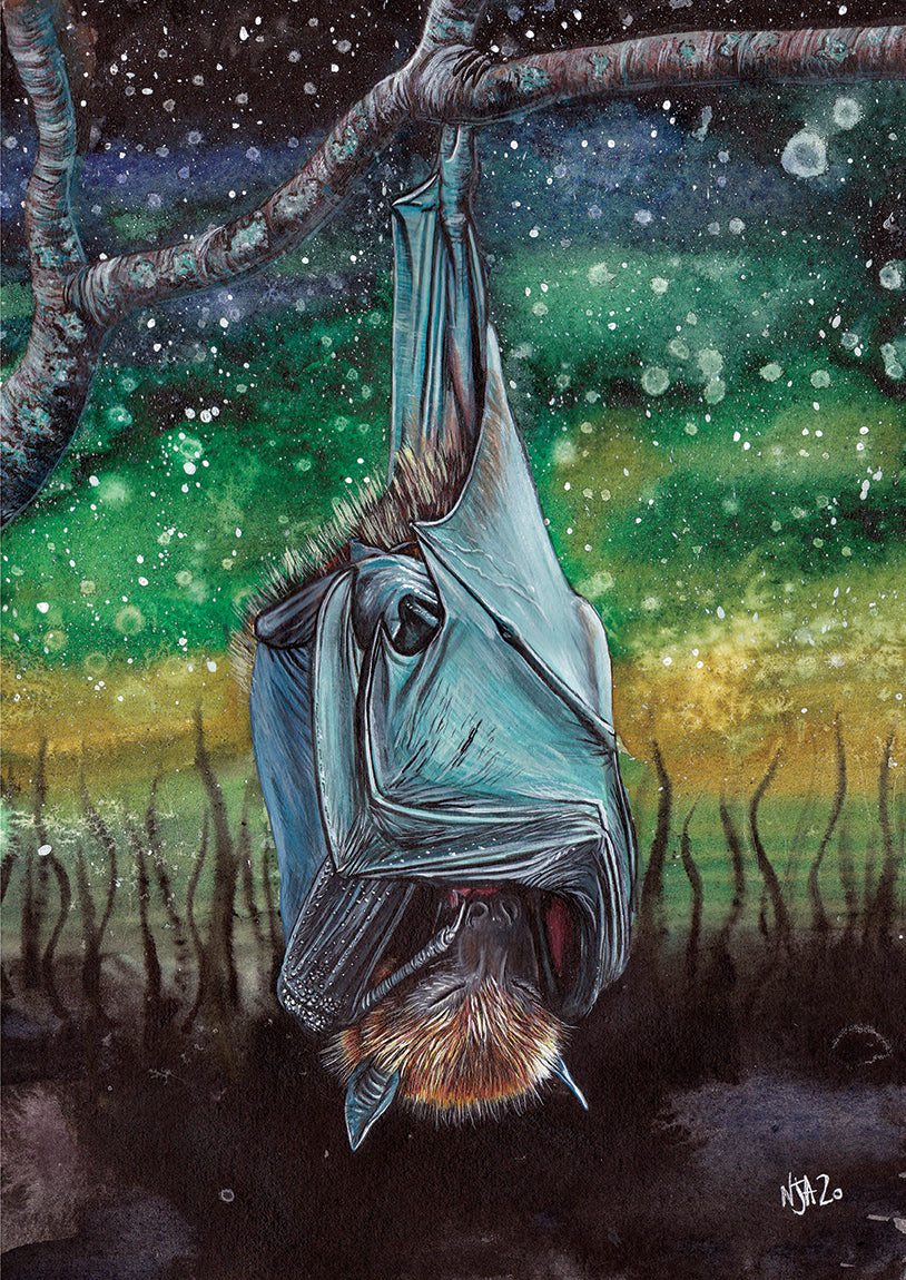 This piece is to remember all the flying foxes who devastatingly preished in Australia's extreme heat. Over two days last November, record breaking heat in Australia's North wiped out almost one-third of the nations Spectacled flying foxes. Climate change is having a severe impact on these bats and I hope the next few months aren't too brutal for them.