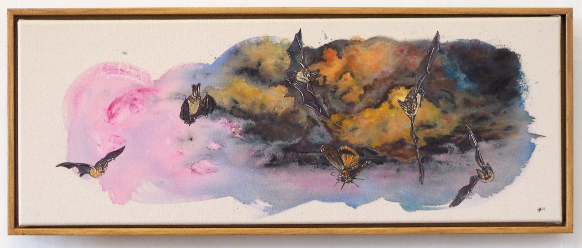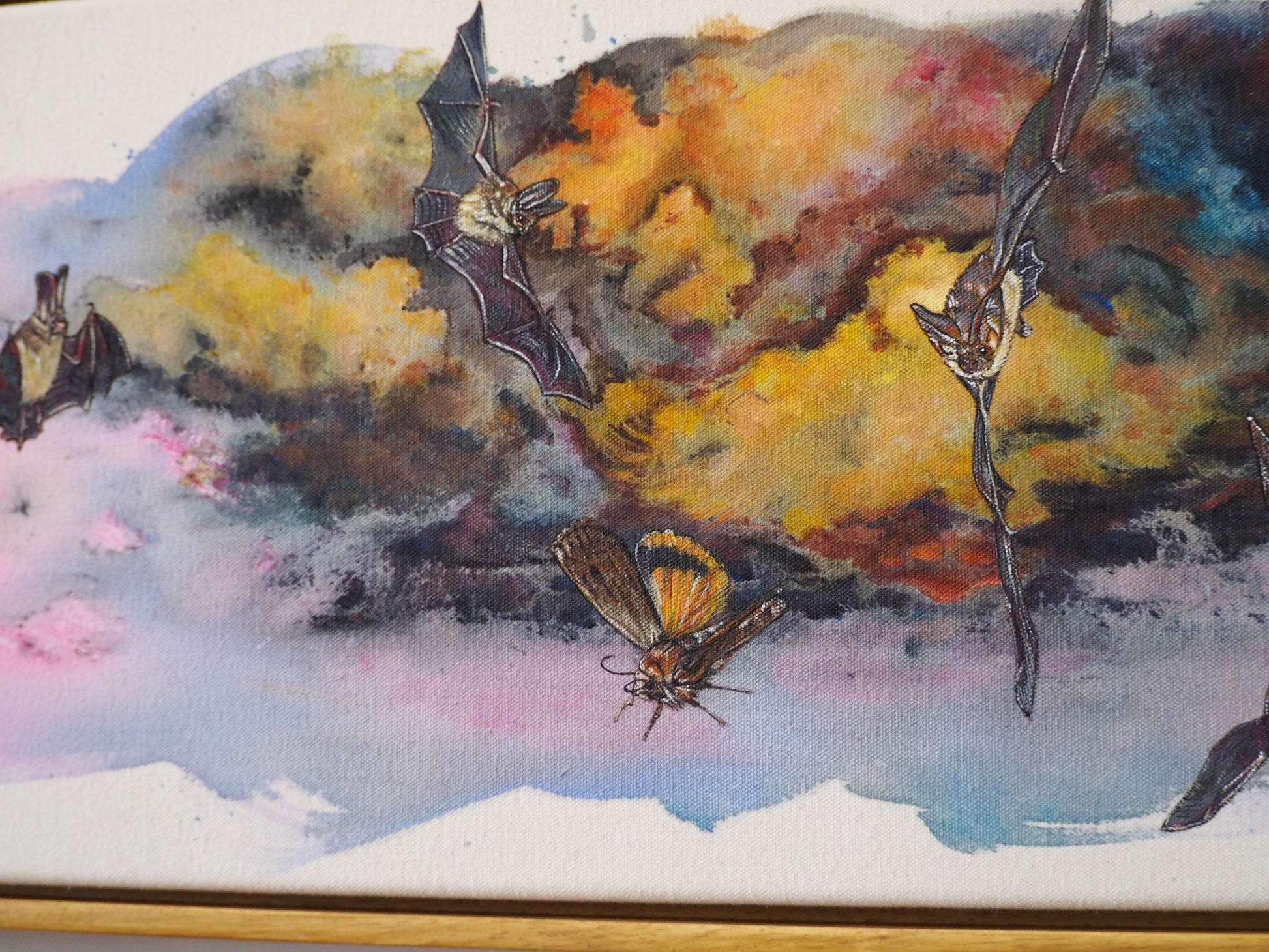 Brown long-eared bats numbers have decreased by over 11% in the last five years, and I'm sure this is related to flying insects (which are their food source) numbers being down by 60% since 2004. In this painting I imagine all the bats in the future, chasing one of the last ever moths they can find, which is one of their favourites – the large yellow underwing moth. Hopefully, we can change this future, by supporting all the creatures within our ecosystem.